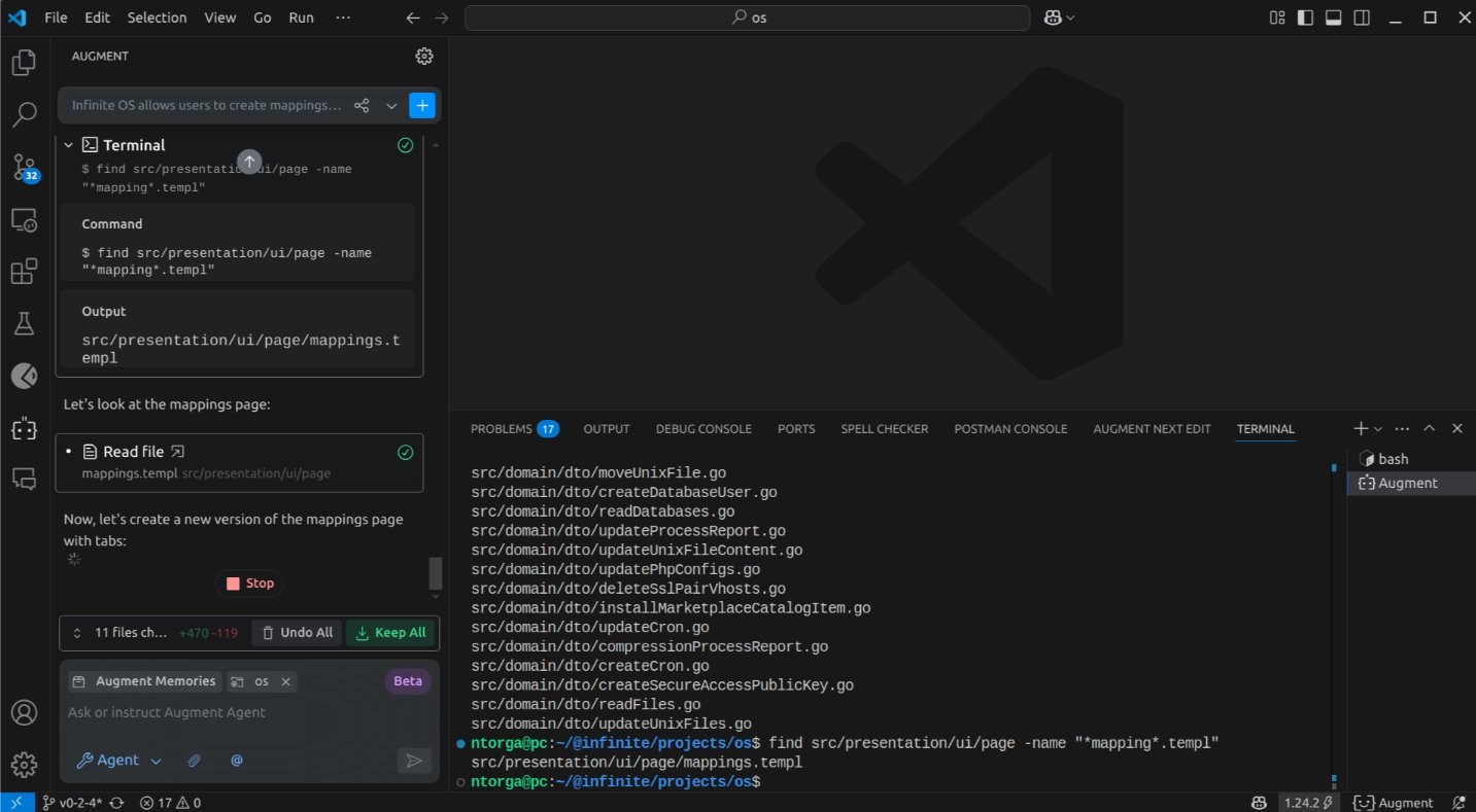 Augment successfully created the DTOs and use case, including the addition of DatabasesDefaultPagination. Interestingly, it scanned 50 lines of code at a time and persisted despite encountering some issues. Notably, when it faced errors with a particular file, it created a new file with a _new suffix, which differed from the approach taken by other tools: